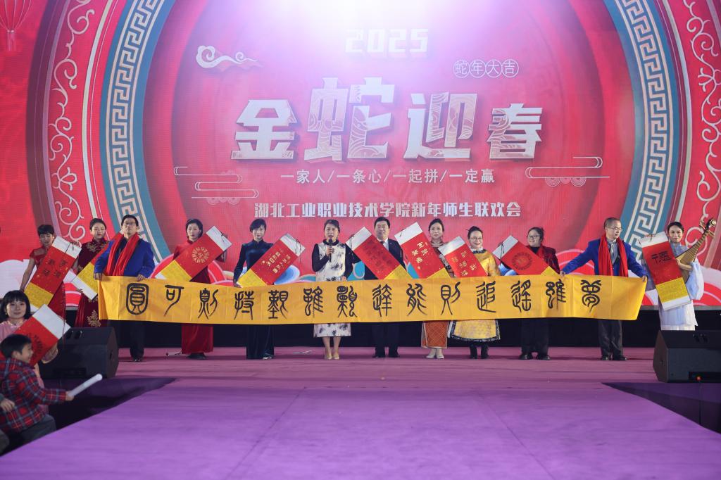 舞台上,伟德BV1946官网经理黄镜潮挥毫书写篆体书法,思政教师王洁弹奏古典乐器琵琶,党支部书记张凤娟带领其他思政教师伴着悠扬的音乐,手持团扇展现着中国传统服装旗袍、秀禾、汉服、马面裙等独特韵味,节目不时地得到台下的阵阵掌声。节目中,黄镜潮经理展示了书写的习近平总书记在2025年新年讲话中的“梦虽遥,追则能达;愿虽艰,持则可圆”一语,用于激励在公司“创全聚本”战略大旗引领下,师生不断增强筑梦远航,全校同心,达圆可期的信心。节目的尾声,还向现场的师生送上了带有书法作品的年历,得到大家的一致喜爱。师生们纷纷表示,这样的节目让大家再次感受到中国传统文化之厚、之美,令人沉浸其中不能自拔,进一步坚定了师生作为中国人的文化自信。